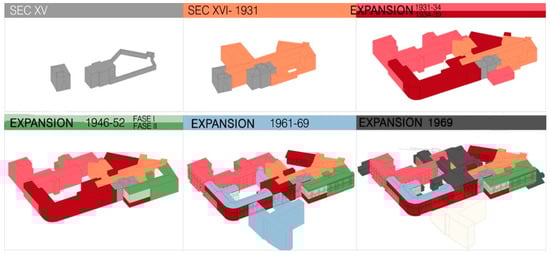 Archive documents and site visits revealed how the hospital had changed since its foundation in 1875. Evidence also emerged of pre-existing structures on the site that were in part transformed and in part destroyed by the construction of the hospital but which constitute an important part of city’s urban history and were used as a focus for the new project [,]. Indeed, the hospital stands on the site of an ex monastery that was abandoned after the Napoleonic suppression and several of its buildings were subsequently incorporated into the new hospital. The hospital was then extended with the construction of a new wing that, in turn, was subject to a series of changes during construction. It was initially proposed to preserve the pre-existing buildings, in particular the monumental church of Santa Maria del Guasto, and built to the rear. However, during construction, it was decided to double the size of the building and incorporate the church into the new structure. However, the church was subsequently demolished.