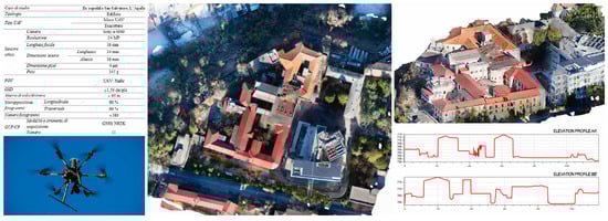 In the knowledge acquisition phase of this study, a multi-rotor Flynovex equipped with a Sony alpha 6000 camera was used in order to carry out an aerial survey. The choice of this type of UAV and equipment stems from other tests performed in different case studies in the post-earthquake period of L’Aquila in 2009 []. It has proved a good choice in terms of several technical aspects, in particular the payload of the camera and the stability of the vehicle during the acquisition phase (Figure 6).