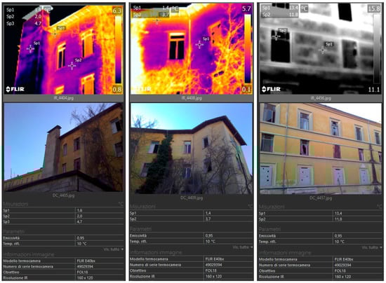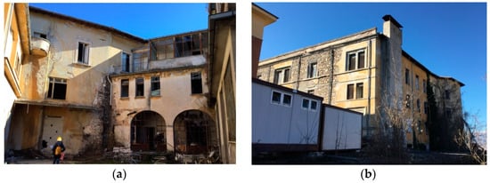In addition, the use of thermal imaging under experimental conditions, varying the surface temperature [], allowed the identification of different stratigraphs and construction techniques, in particular of the oldest part of the complex and surrounding buildings dating back to the 1950s. This section in fact was the most seriously damaged and will therefore be subject to significant interventions structurally, as well as in terms of energy saving (Figure 7) [].