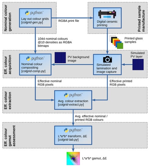 The viability of the digital ceramic printing approach was demonstrated with an image-based acquisition and visual validation of computationally matched target colours from the NCS Exterior Set []. In this paper, we apply a similar image-based process to a wider range of colours to quantify the fidelity with which they are rendered by digital ceramic printing after lamination with a PV module.
