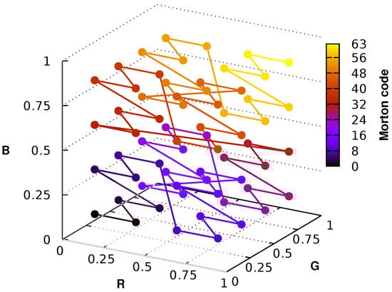The script selects the colours to uniformly cover the cubic RGB space. This is achieved by linearising the 3D RGB coordinates and enumerating them along a space subdividing curve using Morton codes [,]. The corresponding Z-curve meanders through the RGB cube, and is iteratively traversed in intervals of equal length (see Figure 3). The cumulative traversed curve length at each iteration serves as a scalar index (the Morton code) associated with the curve segment’s endpoint. This index is then mapped to the endpoint’s 3D coordinates in RGB space.