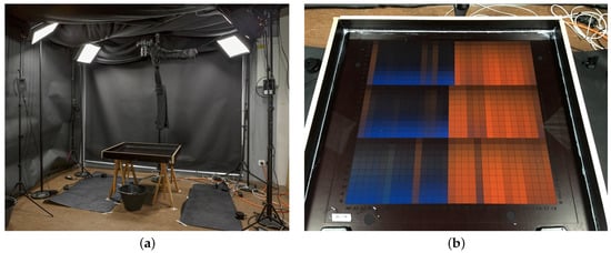 Photographs of each printed glass sample immersed in the basin were taken under identical and reproducible conditions. An overview of our capture setup is shown in Figure 4a. We obtained RAW images from a Canon EOS 5D MkIV DSLR with 24–70 mm lens and fixed exposure setting. The camera was mounted vertically over the water basin containing the sample. A quartet of Aladdin Bi-Flex LED studio lights served as illuminants, with a correlated colour temperature (CCT) of 6170 K measured by a spectrometer (Sekonic Spectromaster C-700). The illuminants were positioned symmetrically at the corners of the sample, and their individual brightness was adjusted for even illuminance using a photometer. The acquisition setup was shielded from stray light and reflections with black drapes.