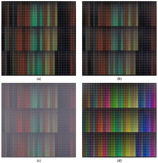 Having acquired colour-calibrated captures of all simulated printed glass laminates, as well as the nominal colour composites as reference, we extracted their effective pixel values in RGB colour space. To this end, we defined regions of interest (ROIs) for each of the 29 × 30 effective printed sample colours in a captured image, and averaged the pixels within them. This masks pixel noise and minor printing flaws from contaminants and scratches on the glass substrate. Each ROI covered ca. 50% of a sample colour’s area to avoid overlapping its neighbour due to inherent positioning errors. In our acquisition process, a ROI covered ca. 60 × 60 pixels from an overall capture resolution of 4200 × 4200. Figure 5a–c shows the effective colours extracted from the sample grid in Figure 2 printed on clear and satinated glass.