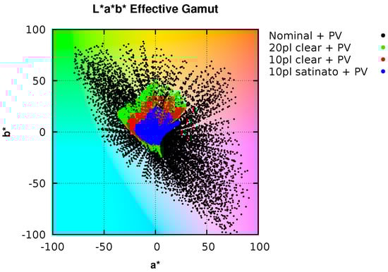 The gamuts of the effective nominal and printed colours are shown as scatter plots in the CIE L*a*b* colour space in Figure 6. The colour space is depicted as a 2D projection onto the [a*, b*] chromatic plane as seen along the L* luminance axis. Neutral grays lie at the origin in the chromatic plane, while saturation corresponds to radial distance. As a projection, this depiction ignores the luminance L* since it is under heavier influence of the PV module than the hue, and we assume that architects are more tolerant towards deviations in perceived brightness than colour shifts.