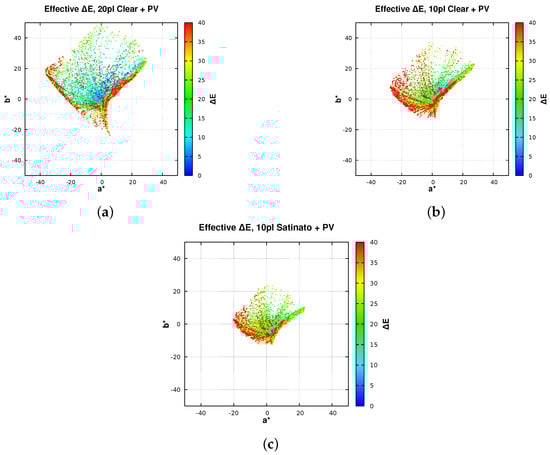 The pairwise colour difference between an effective printed colour and its corresponding effective nominal colour in L*a*b* space is depicted as scatter plots in Figure 7. This data was obtained from our colour transform script described in Section 2.4 and categorised by ink volume and surface finish.