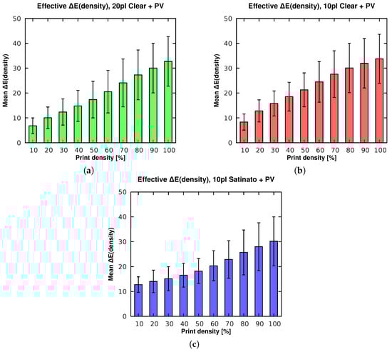 Mean and standard deviation of colour difference between effective printed and nominal colours as a function of print density for 20 pl (a) and 10 pl (b) on clear glass, and 10 pl on satinated glass (c).
