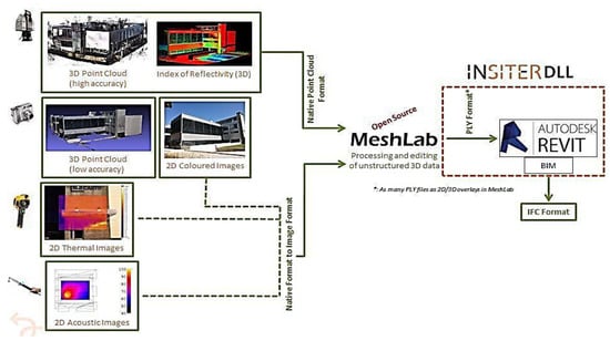 One of the challenges facing building self-inspection is interconnecting the different measurement instruments with BIM [11]. This is an interoperability challenge due to the multiple formats that need to be combined in the common IFC standard. A specific methodology was developed to merge useful digital information for self-inspection purposes and further handling within AutoDesk REVIT (2017 (17.0.503.0), AutoDesk Inc., San Rafael, CA, USA) as BIM worldwide representative software. Suitable digital information sources are 3D point clouds (acquired by laser scanning or photo-based scanning), and 2D images (provided by thermal cameras and sound brushes) [12]. The integration was field-tested at the CARTIF-3 building (INSITER Spanish demonstrator), for inspection tasks directly linked to long-term maintenance planning.