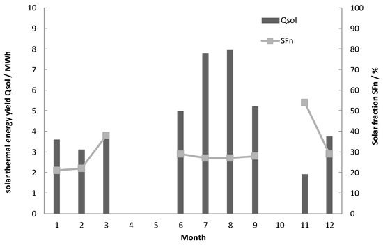 The simulation results of the solar thermal cooling system are shown in Table 3. The annual solar thermal energy yield is 52.8 MWh and the average solar fraction is 30.6%. As shown in Figure 5, the system yields the most thermal energy during the hottest summer days from July to September and the solar thermal energy covers 27.75% of the total energy consumption for cooling. The fraction of solar energy to the total energy consumption is about 32.80% during the coldest winter days from November to March. The system will not be operated in April, May, and October due to the low demand on domestic hot water. However, the average solar fraction would be increased to 40% if a higher than anticipated domestic hot water demand occurs during these months.