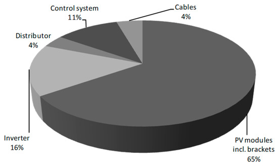 The weight of components costs on the total investment for the two system is shown in Figure 6 and Figure 7. It reveals that PV panels/solar collectors comprise the highest proportion of the total cost of the system, which account for 65% and 42% of the total investment, respectively. The absorption chiller and control system are also the main expenses for the thermal system, which account for 21% and 16% of the total cost, respectively.