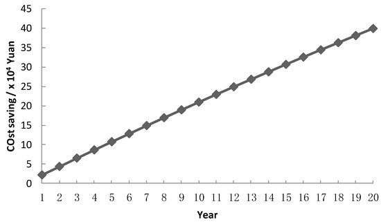 It is supposed that the efficiency of the both systems decreases by 1% in the first 5 years and by 0.8% in the following 15 years due to the component aging. The benefits of the PV system and thermal system during the life span are shown in Figure 8 and Figure 9. It can be seen that the total electricity yield of the PV system is 408.98 MWh within 20 years. The sum of the cumulative cost saving and funding are 229,400 Yuan until the end of the 7th year. Therefore, the payback time is 6–7 years for the PV system.