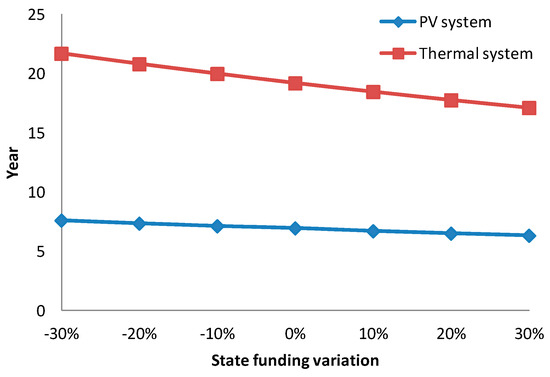 Figure 10 shows the payback time sensitivity analysis with electricity cost variation. It can be seen that the electricity cost makes a stronger impact on the thermal system than on the PV system. Figure 11 presents the payback time sensitivity analysis with state funding variation under the assumption that both the solar PV and thermal systems have the same state funding of 0.42 Yuan/kWh as the base. The payback time of the thermal system would be reduced to 20 years if it receives the same state funding as the PV system.