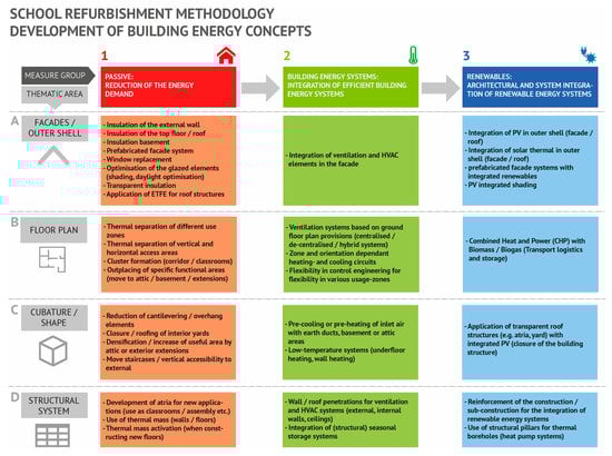 A methodology for energy-efficient building refurbishment generally focuses on factors relating to energy-demand reduction, energy-efficient equipment, renewable-energy systems and human aspects. Ma et al. have identified these as the main categories related to building retrofit technologies [21]. Similarly, Xing et al. have highlighted in their assessment of zero-carbon building refurbishments that advanced technologies should be assessed in a “…consequential manner as a hierarchical pathway…” [30]. They state the retrofitting of fabrics, more efficient equipment, and micro-generation as the hierarchical process towards zero-carbon refurbishments. These theoretical approaches are underlined by practical examples undertaken within the framework of the German demonstration and research project “Eneff:Schule” [31], dealing with the retrofitting of schools towards plus-energy buildings. The measures addressed in the seven case studies include energy retrofitting of the envelope, technical building services, and the use of renewable energy [32].