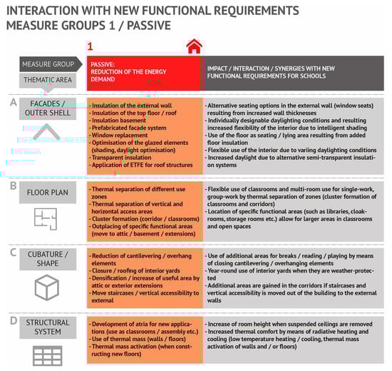 Figure 4 below provides the measure groups for step 1 (passive) in combination with thematic areas A to D. For example, measure group 1A describes passive measures (i.e., architecturally driven), which are being applied to the outer shell of the building. e.g., the application of transparent insulation substituting part of an opaque wall could create new interior spaces in areas that previously did not get enough daylight. An increased wall thickness due to the external application of a new insulated façades system could provide additional window bays or window seats for pupils to rest or read. Following the same principle, a detailed assessment of the impact, interaction and synergies with new functional requirements has been made for the three remaining thematic areas of this first measure group (1B, 1C, 1D).