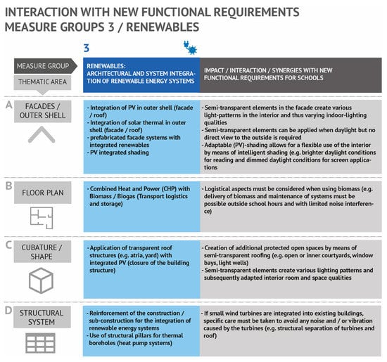 For step 3, the four respective measure groups are shown below in Figure 6. For example, in measure group 3C a combination of step 3 (renewable-energy systems) and thematic area C (cubature/shape) is described. As an example, the application of photovoltaic elements to enclose whole or parts of courtyards could create additional protected spaces for outdoor classrooms or leisure activities for the pupils. Renewable-energy systems could in this instance serve a double purpose of adding valuable environments to the schools, creating awareness by displaying these systems, and providing energy to the building. The interactions with the three remaining thematic areas (3A, 3B and 3D) are part of Figure 6.