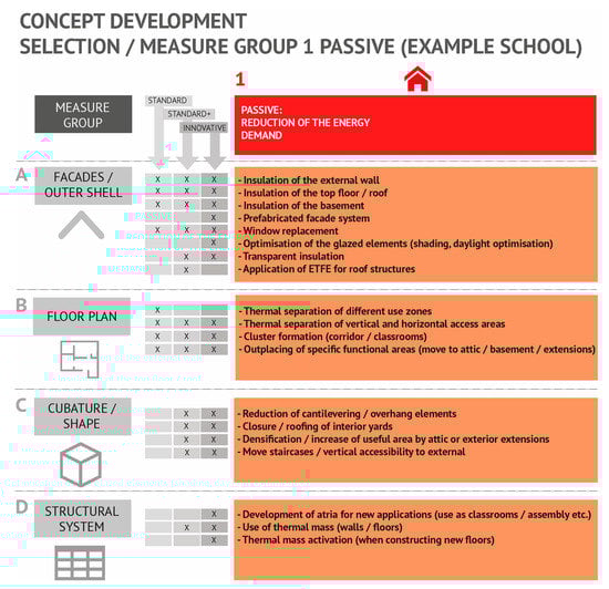 Concept development: selection in measure group 1 (passive) for the case-study school [28].