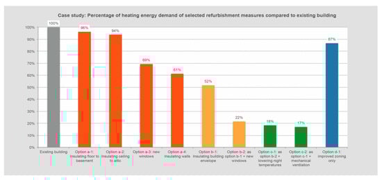 Analysis for the case-study school: percentage of heating-energy demand of selected refurbishment measures compared to the existing building [12,28,34].