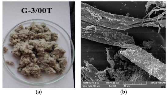 Recycled waste paper fibers G-3/00T Greencel: (a) macro view; (b) SEM image at 1500 times magnification.