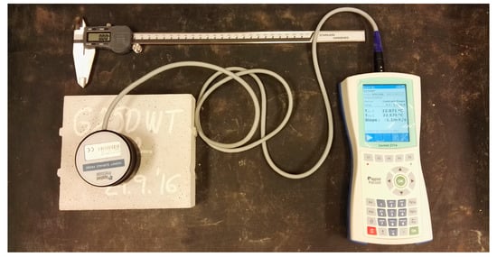 Flow behavior of the freshly prepared fiber cement specimen (indicating its workability) was estimated by a flow table test in accordance with standard []. Densities of fiber cement composites were calculated after 28 days of hardening []. The coefficients of thermal conductivity of hardened fiber cement composites were measured on surface specimens by using the commercial device ISOMET 2114 (Figure 2). Three specimens were prepared to measure thermal conductivity (140 × 40 × 160 mm). Each measurement was repeated five times, and the mean value was reported. The compressive strength of fiber cement composites was also tested according to standard [] by using a compression test machine (FORM+TEST Seidner & Co. GmbH, Riedlingen, Germany) with a loading rate 2400 ± 200 N/s after 1, 3, 7, 28, and 90 days of hardening. Three-point bending test was used for the determination of flexural strength on the aforementioned testing machine with a loading rate of 50 ± 10 N/s.