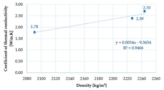 Fiber implementation into mixture has a positive effect on the investigated properties such as density and thermal conductivity of fiber cement composites. Figure 4 illustrates a linear relationship between the density and thermal conductivity of tested fiber cement composites after 28 days of hardening. In Figure 4, each point represents the average of 5 measurements of the individual variables. The thermal conductivity of fiber cement composites decreases with decreasing density. Data set in linear, logarithm, exponential, and polynomial trend forms were statistically tested. The value calculated for the correlation coefficient R2 was 0.9466; this was found, among others, to be appropriate. This R2 value is approximately the same as the critical value of the correlation coefficient (0.9500) for a set of measured values at elected significance level p = 0.05.
