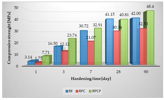 Strength properties, such as compressive strength and flexural strength, were observed over a hardening time ranging from 1 day to 90 days. Figure 5 presents the compressive strength development of cement-based composites containing recycled waste paper fibers. As can be seen, the compressive strength parameter ranges up to 32.5 MPa for RPC fiber composites and up to 48.4 MPa for RPCP cement specimens. The latter value is higher than the compressive strength of the RF sample (42 MPa).