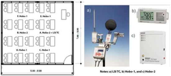 Figure 1 shows the arrangement of instruments inside the surveyed classroom (left), and the images of instruments used in the survey (right). Because there is only one set of LSI-Lastem logger, additional instruments were needed. Six HOBO loggers made by Onset, have been used for this research. These instruments enabled us to measure the thermal environments at six points in each classroom. Two types of loggers were used, that is, the HOBO temp/Relative Humidity (RH) logger (Hobo-1) and the HOBO temp/RH/Light/External logger (Hobo-2). Four HOBO temperature/RH loggers were used for measuring air temperature and relative humidity, and two HOBO temp/RH/Light/External were used for measuring air temperature, relative humidity, and airflow velocity. The specifications of the instruments used in the data collection are displayed in