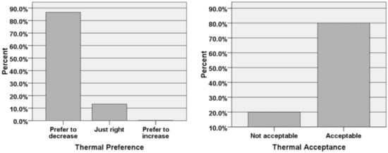 32] showed that the prediction of thermal comfort using a PMV model overestimated the thermal sensation vote (TSV) and the thermal comfort vote (TCV) of the respondents. More than 95% of the respondents were predicted by the PMV method to have thermal sensation in the warmer region(+1 to +3) and only very little (less than 5%) in the “neutral” to cooler region (0 to −3). Karyono [
