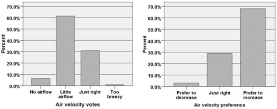 The thermal comfort survey results show that secondary school students were tolerant of the hot temperatures. About 37% of respondents voted the neutral (0) option, while about 20% voted slightly cool (−1), and more than 30% voted slightly warm (+1). Interestingly, there were only about 12% of them who voted the warm and hot regions (+2 to +3). These votes confirmed that despite the hot temperature in the classrooms, most of the students still felt comfortable. In fact, more than 86% of respondents accepted these thermal conditions. Even though the acceptance rate is very high, if there is a chance, 72% of respondents wanted cooler air temperature. Most of the respondents did not feel the airflow in the classrooms so that most wanted the increase in airflow velocity. A very small portion of respondents complained about the air humidity.