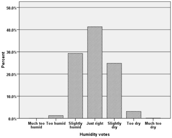 34]. The questionnaire included seven questions, which captured the thermal sensation vote (TSV), thermal comfort vote (TCV), thermal preference and thermal acceptance of respondents. In addition to the air temperature, the questionnaire also intended to obtain the respondents’ votes on the air velocity, air velocity preference as well as the humidity of classrooms. The TSV responses were measured based on ASHRAE standard 55, which uses a seven-point scale to measure the thermal sensation of respondents. The thermal comfort can also be measured by asking the thermal preference and acceptance of occupants. Thermal preference related to the question of whether the occupants prefer to be warmer or cooler or no change. In addition, questions related to the air velocity and the humidity had also been included in the questionnaire (