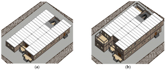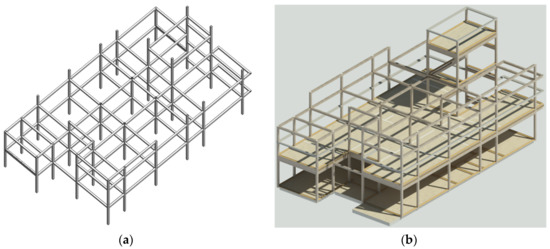 Study of the SIPs as modular movable wall, floor and roof panels supported within the steel framing of 20 cm × 20 cm tubular sections post and beam: (a) Ground Floor, (b) 1st Floor.