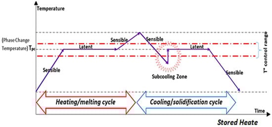 Diagram of temperature change through heating and cooling of a Phase Change Material (PCM) (general case).