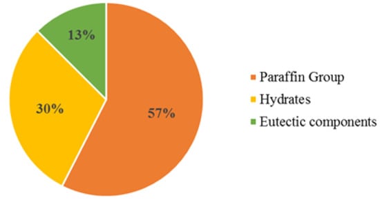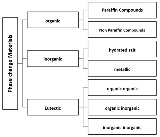 Concerning materials used in research studies, they are given generally by use priority: Paraffin family organic Compounds, hydrates and eutectic components []. Each of these MCPs has its own properties, which can be improved by different configurations by adding onto these characteristics such integration of metal strands to increase its thermal conductivity; the addition of a nucleating agent can eliminate the super-cooling and the use of a suitable PCM thickness can prevent the incongruous fusion. Figure 5 shows a classification of these materials. The distribution of material families, inventoried through their usage in the literature, is presented in Figure 6.