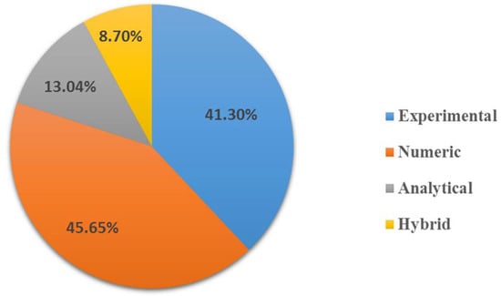 In the thermal domain, we can find several techniques of treatment, measurement and determination of phase change problems solutions, among them numerical, experimental, analytical and hybrid methods. In this sample, it is noted that the first and the second are the main methods used in the papers examined (see Figure 8) [].
