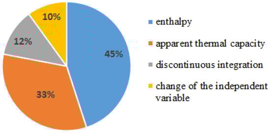 Among the resolution methods of heat transfer problem, the enthalpy method ranks first, while the second order is occupied by the apparent heat capacity method []. For Numerical approaches, the finite elements method is considered as the first tool used in research [] followed by the differences finite method (see Section 6).