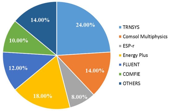 Software such as Softwares PLEIADES+COMFIE (4, IZUBA ÉNERGIES, Fabrègues, France), Simulink (9.1, The MathWorks, Natick, MA, USA), DYMOLA (2018 FD01, Terasoft, CA, USA), SPARK (2.01, Lawrence Berkeley National Laboratory, California, USA) and DesignBuilder (5.0.1.024, DesignBuilder, Vincennes, Ile de France, France) come in the second place. These types of tools are considered to be building modelers with powerful functions for estimating construction, energy, and life cycle costs. These tools include optimization modules that determine building parameters to make a compromise among cost, comfort, GES [,]. The distribution of the simulation tools by their usage is presented in Figure 14.