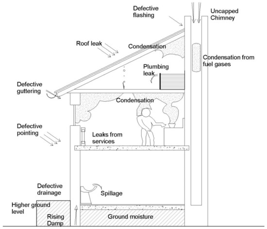 Dampness can be defined as water penetration through the walls and individual elements of a building. Dampness can also be defined as an excessive quantity of moisture contained in building materials and components that cause adverse movements or deterioration, resulting in unacceptable internal environmental conditions [1]. Dampness is defined as the amount of moisture content present in a material and classified it as capillary moisture content, equilibrium moisture content, hygroscopic water content, total water content, and potential moisture content [2]. Some authors have argued that dampness contributes to more than 50% of all known building failures [3,4,5]. Therefore, the ultimate objective of any humidity study is to identify the lead source of moisture and to recommend steps to remedy the problem [6]. Sources of dampness can be classified as rising humidity, penetrating moisture, condensation, and pipe leakages [2,5]. Nevertheless, a high proportion of building dampness is caused by rising damp, penetrating damp (rain penetration), and condensation, which are the three most common types of dampness that affect a building. Rising humidity occurs as a result of the capillary suction of moisture from the ground into porous masonry building materials such as stones, bricks, blocks, earth, and mortars [7]. The illustration of possible ways that buildings can get wet is provided in Figure 1.
