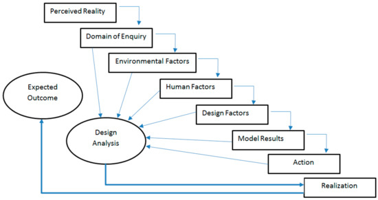 In determining the material integrity of the building envelopes, we designed a model to show how CFD analysis can effectively influence the final outcome of the building during the design stage. Factors that influence building outcomes and their interactions can be well understood in the design analysis, which functions as a system (Figure 4). The model results determine what actions are necessary for realizing the expected outcome. Thus, the process starts out with a perceived outcome (desired outcome) and ends with an action plan for its realization (expected outcome). The continuous testing of the material integrity using CFD provides an opportunity to eliminate possible sources of high humidity within the interior of buildings. Design tools used for the analysis are: