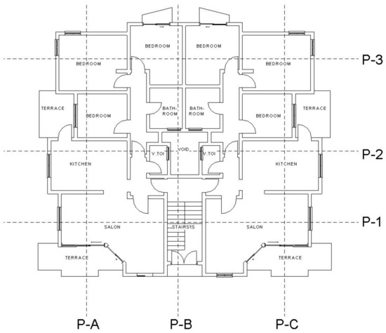 This simulation (Figure 6) is an example of an apartment building, which is interesting because of its orientation on the site and the prevailing wind direction. The positioning reflects some indication of what to expect in areas that would receive a direct flow of air and the spaces with single/double openings show spaces that would retain more humid air. The simulation was generated with boundary conditions, fixed environmental conditions, the nature of ventilation, and the materials used were specified. In the fluid simulation, the scenario for the parameters is taken during the coldest winter period. The western side, according to the building orientation is taken as the western wind direction, which carries the velocity-inlet boundary and temperature conditions. The eastern side is assumed as the pressure-outlet boundary condition. The exterior walls, concrete floor, and roof of the apartments were assumed as the wall boundaries. The interior walls, doors and the windows of the apartment were assumed as the interior boundary conditions. The analysis was done comparatively for two different wall materials, the brick, and the adobe. All the parameters of the boundaries were taken from the documented weather condition of North Cyprus, according to the meteorological department, LLC, © 2016, based on data obtained on 19 December 2016.