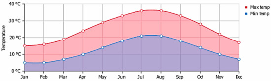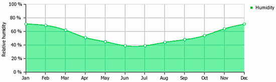 Spring and autumn are short, typified by changeable weather, with occasional heavy storms battering the coast in spring and a westerly wind, called “meltem” carrying the influence of Atlantic depressions to this far eastern end of the Mediterranean [34]. From mid-May to mid-September the sun shines on a daily average of around 11 h. Temperatures can reach 40 °C (Figure 9). On the Mesaoria Plain, although lower on the coasts, with a northwesterly breeze called “Poyraz” prevailing. The skies are cloudless with low humidity between 40% to 60% humidity ratios (Figure 10). Thus, the high temperatures are easier to bear. The hot, dry, dust-laden “sirocco” wind blowing from Africa also finds its way to the island. Short-lived windy conditions resulting from relatively small depressions prevail throughout the winter, with 60 percent of rainfall between December and February. The Northern Range receives around 50 mm of rain per year, whereas the Mesaoria Plain receives only around 30–40 mm.