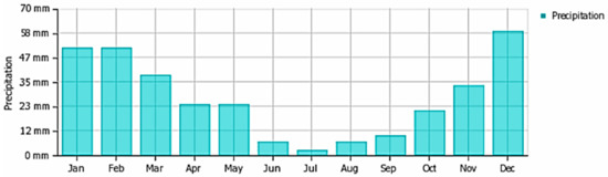 The bulk of the precipitation is concentrated between December and January. In summer, most of the island is affected by a shallow trough of low pressure spanning from the great continental depression centered over Southwest Asia [31]. The atmosphere of the coastal parts is less intense than the core inland because the sea ion atmospheric humidity is constantly present there. The temperature of the sea can rise to 28 °C in August but does not fall below 16 °C between January and February [32]. The average rainfall of 402 mm, however (which is below Mediterranean average), conforms more to the climate pattern of the eastern Mediterranean. The coastal plains get a little rainfall, on average, from 34 to 50 mm (Figure 8), falling predominately in the winter.