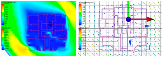 The finite element summary follows a total of 696,106 nodes: 627,484 fluid nodes and 68,622 solid nodes, and a total 2,803,037 elements, 2,114,847 fluids, and 688,190 solid elements were calculated. The simulated space was also gridded automatically by the authorizing tool, and each grid division is 2 m by 2 m. The magnitude of air flow and the calculated temperature through the apartments can be seen in Figure 12. The flow of air can be seen moving directly into the window openings facing the prevailing wind, while the windows of the other flat have a slurry air gain. The spaces with cross ventilation have an exchange of air with high flow rate. Diffusion and return of air can be seen for the two scenarios by the arrows, where the sizes, direction, and color of the arrows, called the velocity vector, show the movement of air and how it returns. The nature of the airflow has an effect on the room temperature (Figure 12).