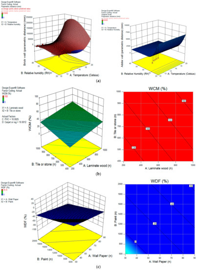 Figure 14. (a) Response surface plots of the mutual effect of the temperature and relative humidity through the apartment. Design-Expert Software 10. (b) Response surface plots of the mutual effect of the tile or stone and laminate wood on WCM. (c) Response surface plots of the mutual effect of the paint and wallpaper on WDF.