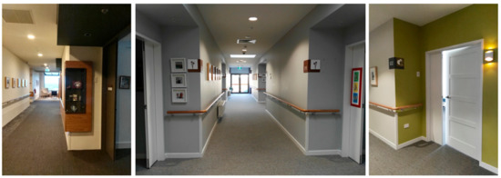 In Facility A, there are memory boxes outside residents’ rooms along the corridors. The inclusion of personal objects in the memory boxes, such as photos and other artefacts, facilitates residents with dementia to reinforce their long-term memory and reflect upon their past experiences within their remaining capabilities. This can personalize the institutional setting and enhance the sense of identity by creating a familiar environment and serve as an effective orientation cue for wayfinding [24]. Displaying personal objects along the corridor may also stimulate social interaction and conversation among residents and enable the staff to have better understanding of the residents about their stories and preferences [25]. However, the corridors at Facilities B and C only have pictures hanging on walls and color contrast without memory boxes (Figure 5, Table 5).