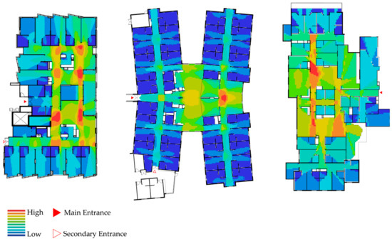 As shown in Figure 6, the four wings of the Facility B have low connectivity values (dark blue), which are more visually and socially isolated. On the contrary, both Facilities A and C have higher connectivity, especially their communal spaces (living and dining areas), which can facilitate social interaction among users with the ease of physical and visual access (Table 6). The least connected spaces are bathrooms and service rooms, as represented by dark blue on the analysis diagrams.