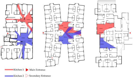 Isovist analysis was initially developed by Tandy in 1967 for landscape surveys [33]. By defining ‘isovist’ as a ‘set of all points visible from a given vantage point in space’, Benedikt introduced an analytic method for quantitative descriptions of spatial environments in 1979 [34,35]. This is an effective tool to illustrate the visibility of a particular point in the layout plan. Since the domestic kitchen, found at each dementia support facility, is a key focal point in the communal space, it is used for developing the isovist analysis diagrams in Figure 7.