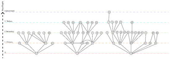 In view of the wandering behavior and cognitive impairment of residents with dementia, it is preferable for dementia support facilities to have lower relative depth for ease of wayfinding and spatial orientation. Step Depth Analysis is an effective visual tool to illustrate the relative depth of the spaces. Different types of spaces on the layout plan are firstly labelled. Spaces with different levels of step depth are represented in the layout by different colours, ranging from red, orange, green, cyan, to purple (Figure 8). The physical connections of different spaces on the layouts are then represented by a tree diagram using the main entrance as Level 0 (Figure 9). In general, communal spaces close to the main entrance have lower step depth, whereas bedrooms have higher step depth.