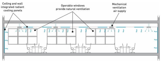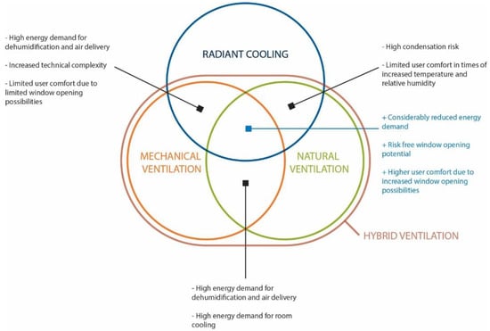 Considering the currently increasing energy costs and growing ecological concerns, hybrid ventilation systems that integrate natural ventilation solutions with mechanical ventilation are effective for achieving user comfort with less energy and technical complexity [,,]. Increased user comfort has been reported in association with window opening potential and user control over natural ventilation [,]. Using conventional (all-air) cooling systems, cooling loads are extracted via the circulation of large volumes of cooled or conditioned air. This approach not only demands large quantities of energy, but also requires considerable space for the ducts and technical equipment with respect to the circulated volume of air. This is essentially because, in the cooling case for instance, the entire room needs to be cooled by air to achieve the desired air and target operating temperatures. One efficient cooling method is an air–water method that involves a combination of mechanical ventilation of cooled air and radiant cooling via chilled surfaces incorporated in the ceiling, floor, or walls. Concerning such a system, the supplied and conditioned volume of air is minimized to the amount required to maintain a certain indoor air quality, which is often related to the accumulated CO2 level in the room. Different from conventional (all-air) air-conditioning systems, the air–water approach is sensible because the specific heat capacity of water is higher than that of air, which makes it 4000 times more efficient for energy transport []. Feustel and Stetiu [] claim that 40% energy savings could be attained using radiant cooling compared to conventional air-conditioning approaches. In such systems water circulates through pipes that are in contact with a surface. A more efficient method would perhaps include hybrid ventilation to make use of possible passive techniques that involve window ventilation, mechanical ventilation, and radiant cooling. The diagram in Figure 1 summarizes the concept of the proposed system of hybrid ventilation coupled with radiant cooling. It also lists the limitations of other coupling possibilities that involve only two of the three components.
