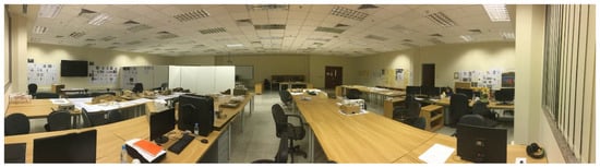 An architectural studio classroom in the Faculty of Environmental Design, King Abdulaziz University, was selected as a case study for this analysis. This room was selected mainly because architecture students tend to work long hours at school to make effective use of the open hours. Additionally, such a classroom has the potential to replace existing suspended ceiling panels with radiant cooling surfaces. Recent market developments and studies on capillary mats indicate great potential for integration of suspended ceilings with effective heat transport and temperature uniformity [,,].