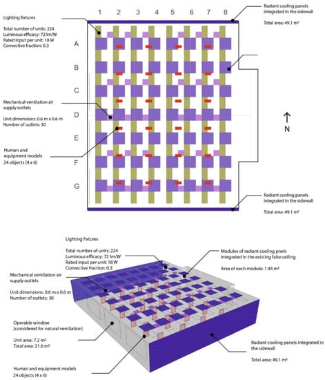 (Top) reflected ceiling plan of the classroom, showing the radiant cooling panels integrated into the false ceiling. (Bottom) isometric of the simulation model showing the windows and the wall integrated panels.