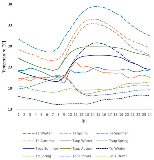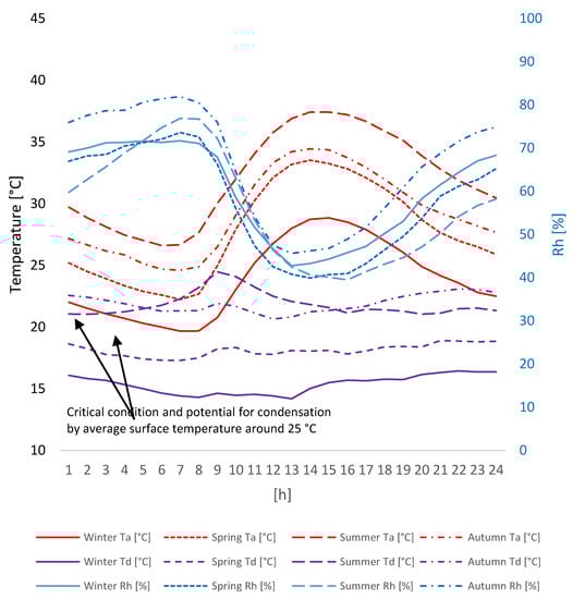 It was important to highlight the main climate characteristics of the location of the study for the next analyses. Figure 4 has the primary axis represent Ta (red curves) and Td (purple curves) for an average day in each season. The corresponding relative humidity (Rh) (blue curves) is displayed on the secondary axis. The calculation of the Td was done using the August–Roche–Magnus approximation [,] presented in Equation (1), where a = 17.625 and b = 243.04: