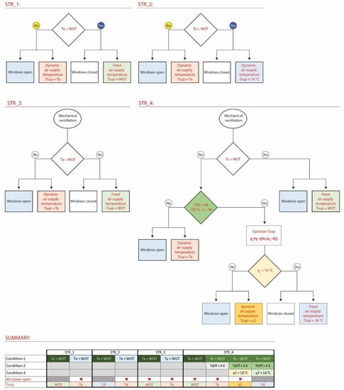 Figure 6 outlines the control strategies. STR_1 and STR_2 of Tsup used mechanical ventilation for the intake air, which was delivered via the air outlet located in the ceiling of the room and was required to maintain a satisfactory level of indoor air quality. Ta was assigned as Tsup and the window would open in both STR_1 and STR_2, if Ta was equal to or less than WOT. The window would close and WOT would be assigned as Tsup in STR_1, if Ta was higher than WOT. The same applied to STR_2, except that the Tsup was fixed at 16 °C if Ta was greater than WOT.